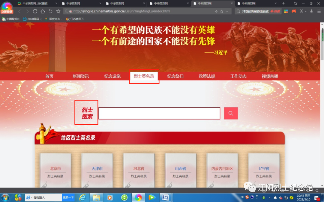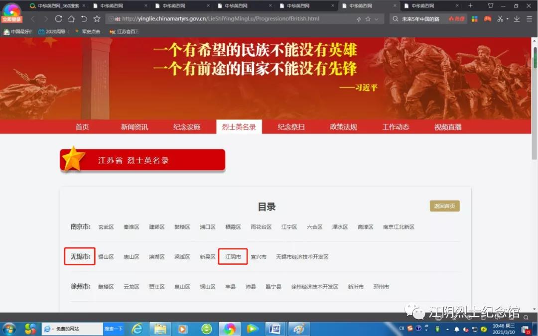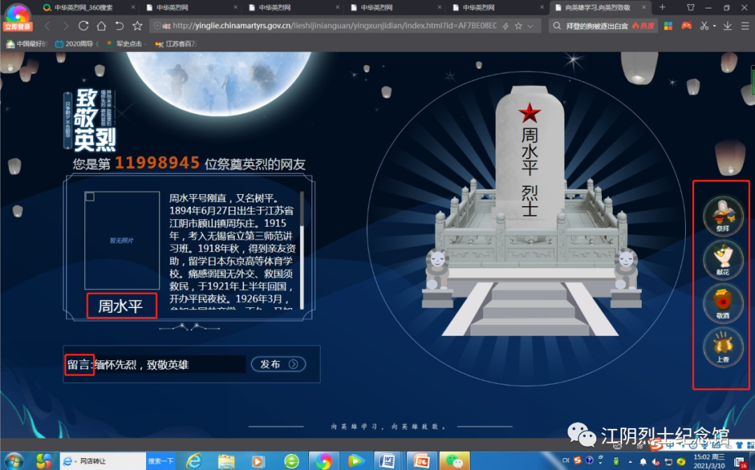 在中華英烈網(wǎng)上,江陰市民們可通過“烈士英名錄”版塊,找到江蘇省界面,然后選擇無錫市江陰市的烈士;也可以通過“烈士搜索”輸入英烈姓名查詢,就可看到烈士的生平事跡,重溫英烈革命故事。同時點擊烈士信息頁上“祭掃烈士”按鈕,再點擊“祭拜”、“獻花”、“敬酒”、“上香”等不同的按鈕,就會在頁面上呈現(xiàn)出對應效果,還可通過“留言”在網(wǎng)上寫下自己對烈士的思念和緬懷。