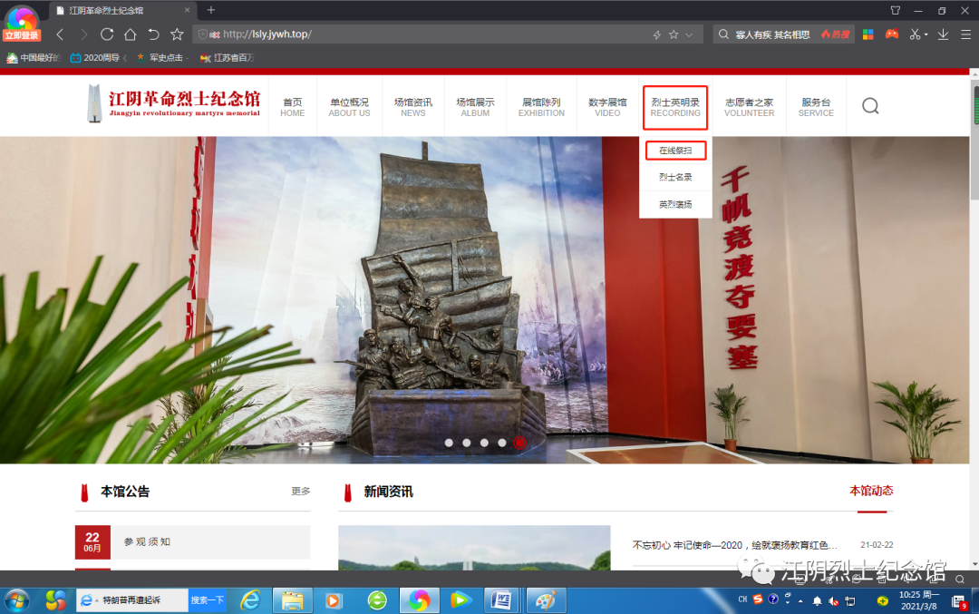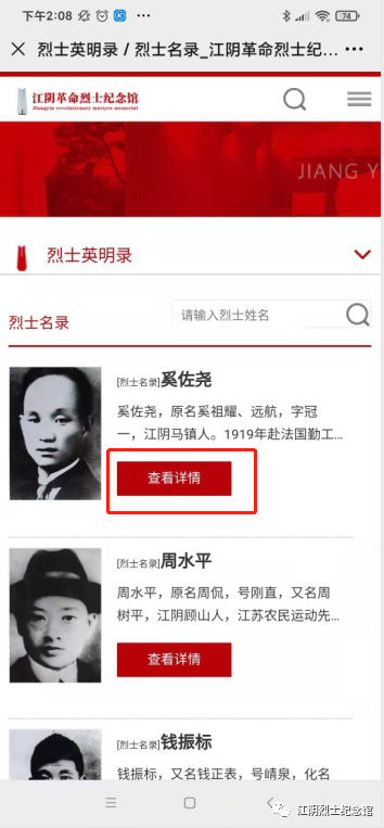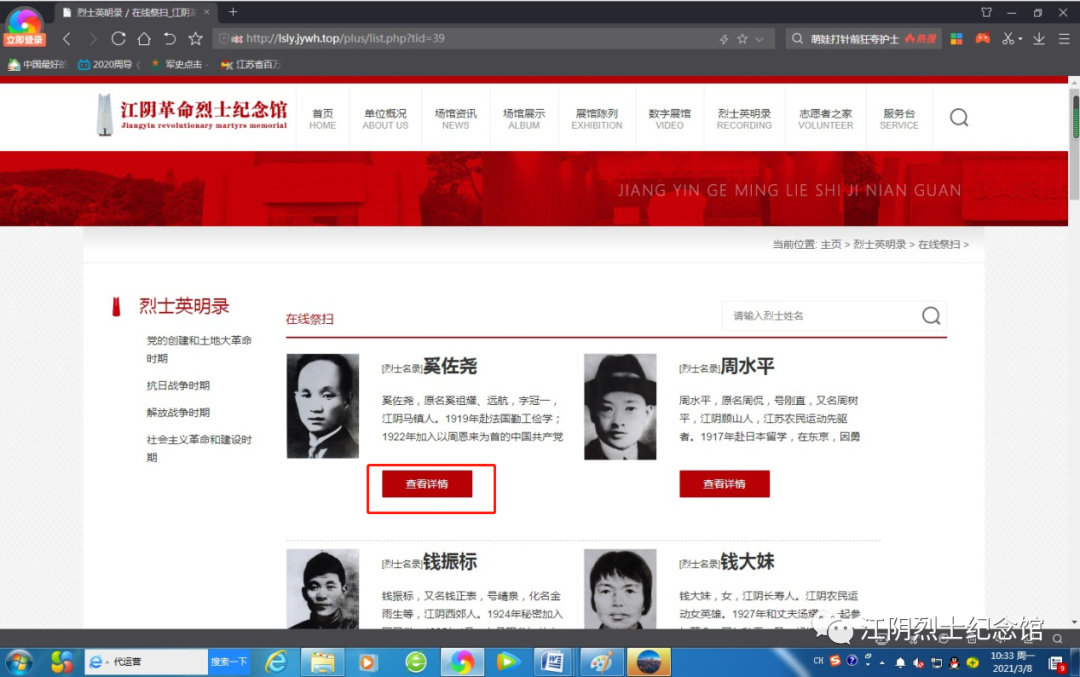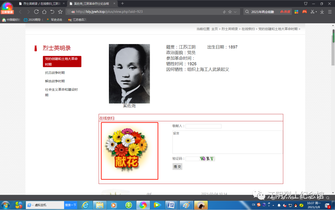 在江陰市革命烈士紀念館網(wǎng)站主頁上點擊烈士英名錄中“在線祭掃”條目,就可以看到所有烈士的名錄,再點擊查看詳情,就可看到烈士的基本信息與英雄事跡,在下方對話框中通過“留言”寫下自己的思念和緬懷,再點擊“獻花”按鈕,向烈士敬獻鮮花。