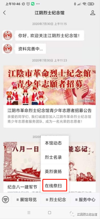 微信搜索公眾號:江陰烈士紀念館,進入后,點擊烈士紀念中“在線祭掃”欄目,具體流程與網(wǎng)站祭掃一致。