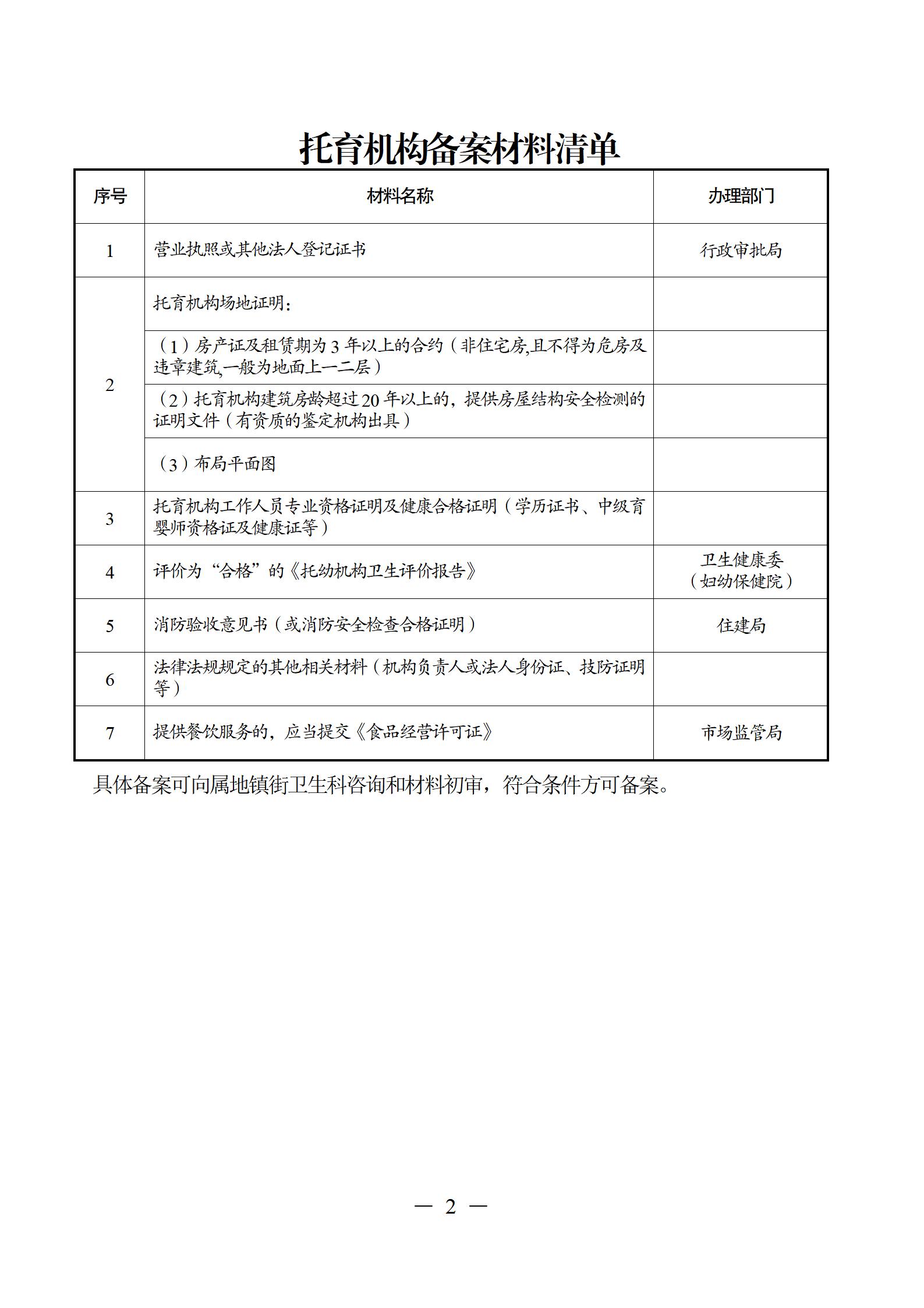 二、依據(jù)《人口與計(jì)劃生育法》規(guī)定,托育機(jī)構(gòu)的設(shè)置和服務(wù)應(yīng)當(dāng)符合托育服務(wù)相關(guān)標(biāo)準(zhǔn)和規(guī)范,托育機(jī)構(gòu)應(yīng)當(dāng)向縣級(jí)人民政府衛(wèi)生健康主管部門備案。我市開展托育服務(wù)的機(jī)構(gòu)必須向市衛(wèi)生健康委備案?!锻杏龣C(jī)構(gòu)備案材料清單》附后。