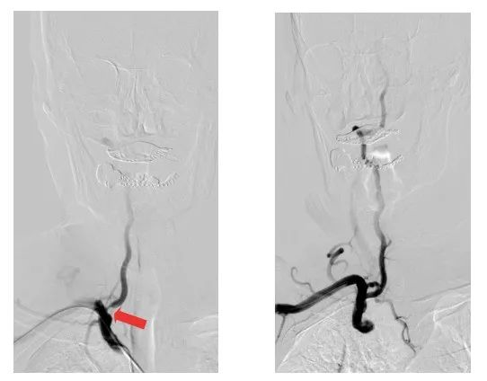 術(shù)前術(shù)后影像對比(紅色箭頭所指位置為狹窄處)