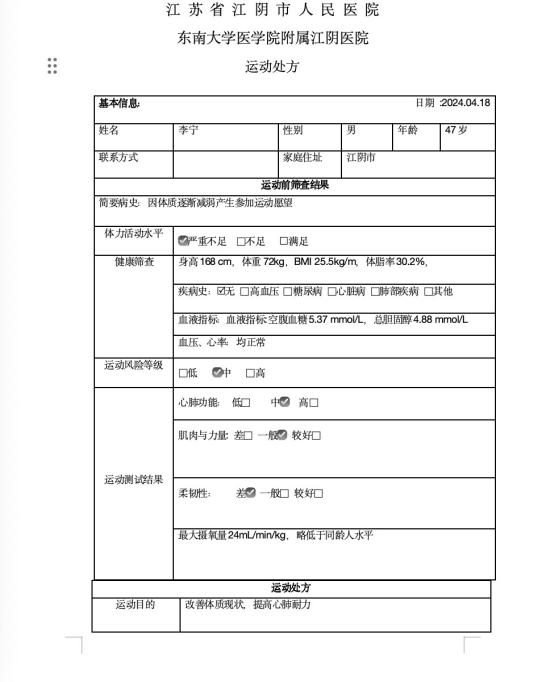 我局依托江陰市人民醫(yī)院、江陰市體育中心,為參與運動損傷治療、糖前篩查、慢病防治、體質(zhì)監(jiān)測的市民提供個性化的運動處方。這些運動處方根據(jù)市民的體質(zhì)狀況和健康狀況,量身定制了科學的鍛煉方法和飲食建議。例如,針對心肺功能較差的市民,處方中可能會建議進行有氧運動,如快走、慢跑等;針對肌力水平較低的市民,處方中可能會建議進行力量訓練,如舉重、俯臥撐等。通過遵循這些運動處方,市民可以更好地調(diào)整自己的飲食結(jié)構(gòu)和鍛煉方式,從而提高健康水平。