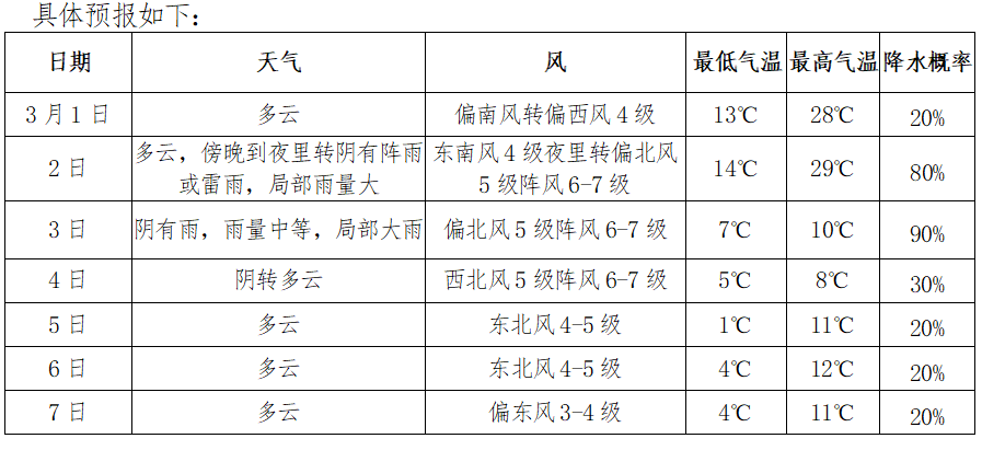 根據(jù)最新氣象資料分析,3月1-2日白天我市以多云天氣為主,氣溫明顯上升;受強冷空氣南下影響,2日夜里到3日將出現(xiàn)明顯降雨和大風降溫天氣過程,雨量中等局部大雨,期間可能伴有雷電、雷暴大風等強對流天氣,4日陰轉(zhuǎn)多云,5-7日多云。風力方面:1-2日風力逐漸增大,2日夜里-4日偏北風將增大至5級陣風6-7級。氣溫方面:1-2日氣溫明顯偏高,最高氣溫可達28-29℃,3日氣溫將明顯下降,24小時最高氣溫降幅近20℃,3-5日48小時最低氣溫降幅7℃左右,5日早晨最低氣溫1℃;5-7日氣溫變化平穩(wěn),最高氣溫11-12℃。