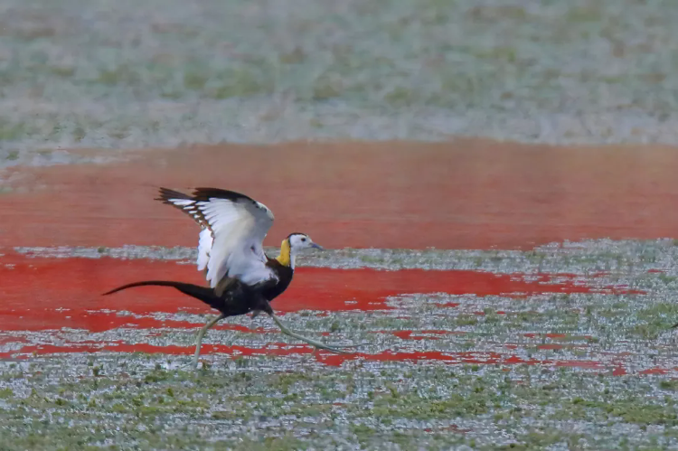 形態(tài)特征:水雉成鳥(niǎo)體長(zhǎng)39-58厘米,尾羽長(zhǎng)達(dá)25-35厘米。黑白分明的頭部與亮黃色頸斑形成鮮明辨識(shí)度,背部至尾部羽毛呈現(xiàn)黑褐色至淺棕色漸變。水雉因優(yōu)雅的泳姿被賦予“凌波仙子”的美譽(yù),其獨(dú)特的外觀和行為使其在眾多鳥(niǎo)類(lèi)中脫穎而出。